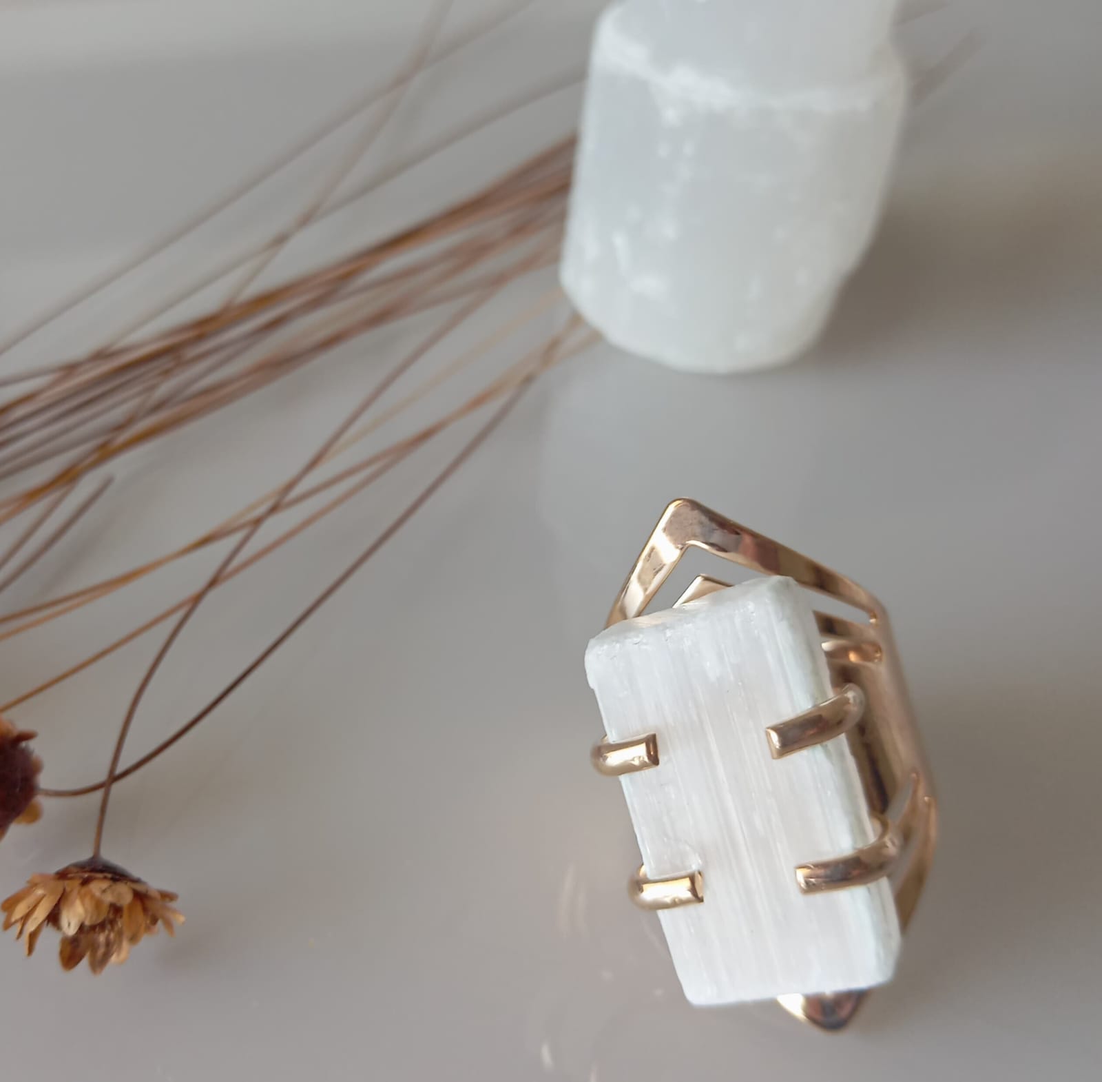 Anel drusa de Selenita com banho dourado