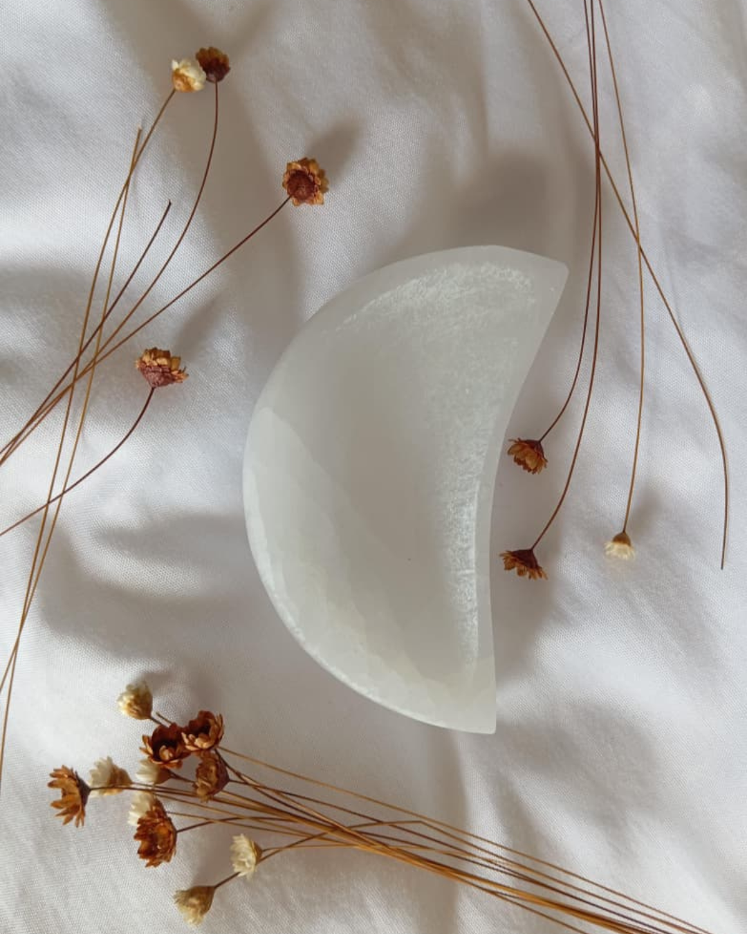 O Bowl Meia Lua de Selenita é uma peça elegante e funcional. Ideal para guardar e energizar pequenos cristais, joias ou amuletos.